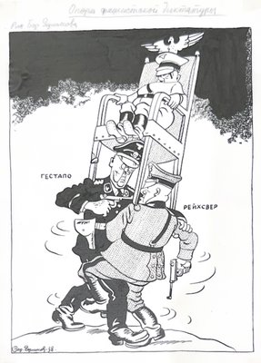Cartoon (from left to right): The Fascist Dictatorship's Crutches / The strong shoulders that support the fascist dictatorship. The "Pillars" of Fascist Dictatorship are on their last legs.